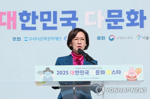 대한민국 다문화 페스타 축사하는 원민경 장관 (서울=연합뉴스) 신현우 기자 = 원민경 성평등가족부 장관이 25일 서울 남산 백범광장에서 열린 2025 대한민국 다문화 페스타에 참석해 축사하고 있다. 우리다문화장학재단과 국가기간뉴스통신사 연합뉴스가 주최하고, 서울특별시와 성평등가족부가 후원하는 행사는 '다(多)함께 걷는 우리, 다(多)양한 문화를 만나다'를 슬로건으로 열렸다.2025.10.25 nowwego@yna.co.kr