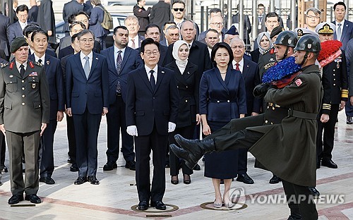 (앙카라=연합뉴스) 임형섭 황윤기 기자 = 튀르키예를 국빈 방문 중인 이재명 대통령은 25일(현지시간) 부인 김혜경 여사와 함께 한국전 참전 기념탑에 참배했다.
