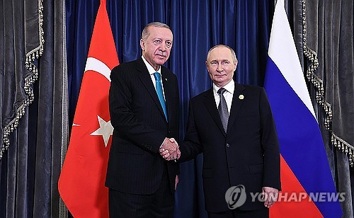 (톈진 UPI=연합뉴스) 지난 9월 1일(현지시간) 중국 톈진에서 열린 상하이협력기구(SCO) 정상회의에서 에르도안 대통령이 블라디미르 푸틴 러시아 대통령과 악수하고 있다. 2025.11.26 photo@yna.co.kr