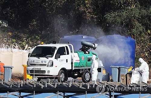 (화성=연합뉴스) 홍기원 기자 = 16일 고병원성 조류인플루엔자 항원이 확인된 경기도 화성시 한 산란계 농장 주변에서 방역차가 방역을 하고 있다.